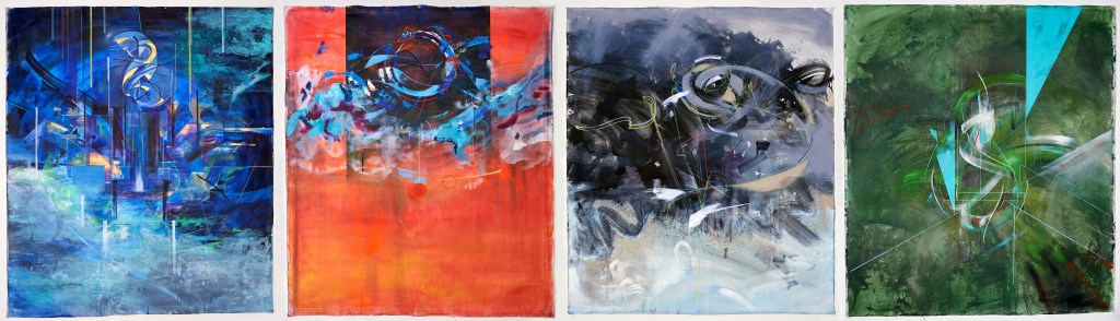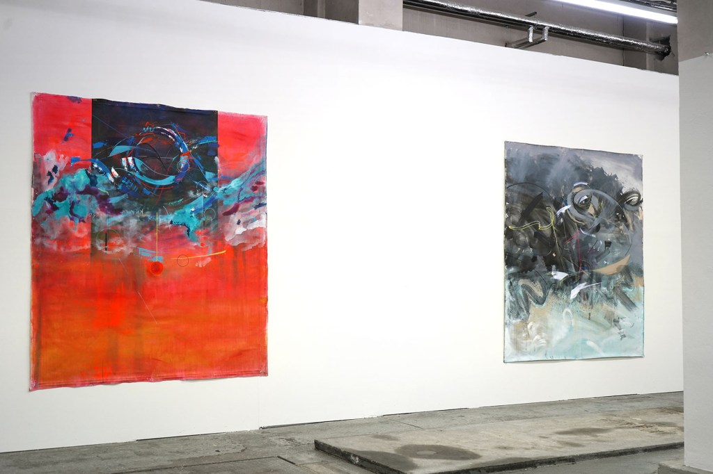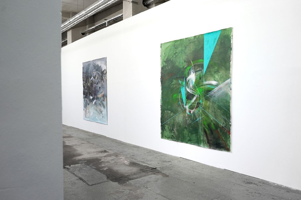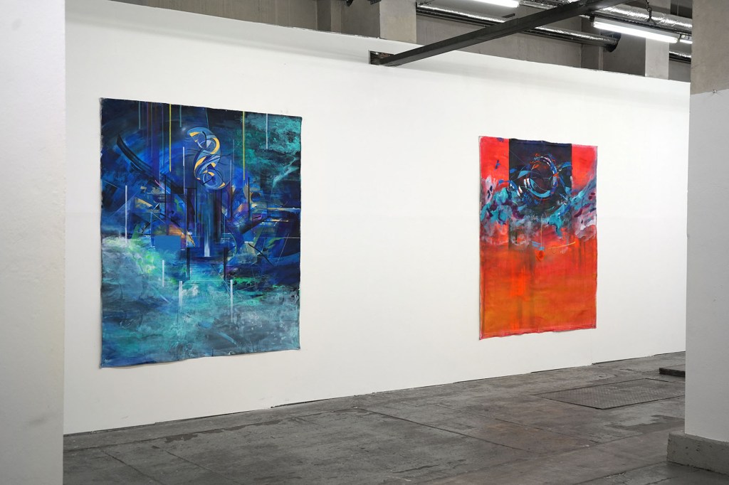 „Die Zweite Haut“ bezeichnet eine Gruppe von vier großformatigen Malereien (je 240 x 200 cm), die ich als Hauptpositionen einer bildnerischen Expedition verstehe. Innerhalb dieser Vorstellung unternahm ich einen Versuch eines postmodernen Rituals zur Jahreswende. Im Vordergrund der künstlerischen Arbeit steht dabei das performative Momentum und die Einschreibung des selbigen in das (seiner Natur nach) feststehende Medium der Malerei. Die Größe der Bilder ist dabei eine Notwendigkeit, die sich aus diesem eher physischen Anspruch ableitet.
