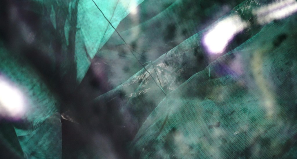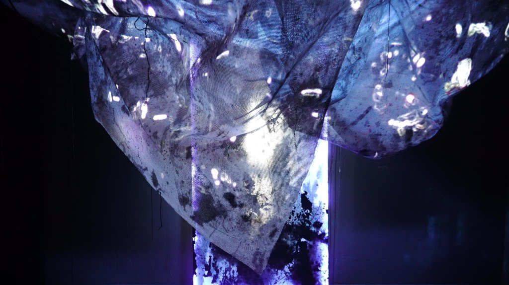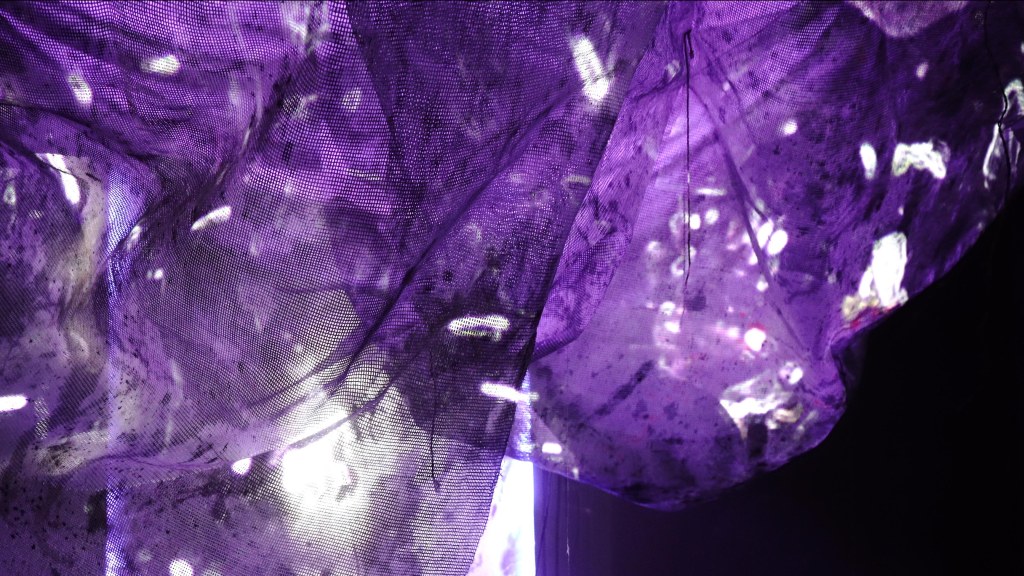 Mit meinen Stoffen und Schnüren übe ich mich nun daran „Huldas Gespinst“ zu atmosphärischen Rauminstallationen zusammenzufügen. Dabei sollen ortsspezifisch variierende Räume entstehen, die von Tropfsteinhöhlen inspiriert sind, als auch von Wolkengebilden (die hier allerdings staubtrocken sind) und von Insekten-Kokons. Dafür benutzte ich lichtdurchlässige Stoffe und Netze, Schnüre und LED-Lichttechnik. Ein vielschichtig-durchsichtiges Gebilde wird geformt und durch eigens kreierte Leuchtkästen ergänzt, auf welchen ebenfalls Stoffe gespannt sind, die mit gesammelten Pech bzw. Sediment behandelt wurden. Gesammelte Tonaufnahmen aus Quellen tönen aus dem Inneren des Gebildes und verleihen ihm eine Lebendigkeit.