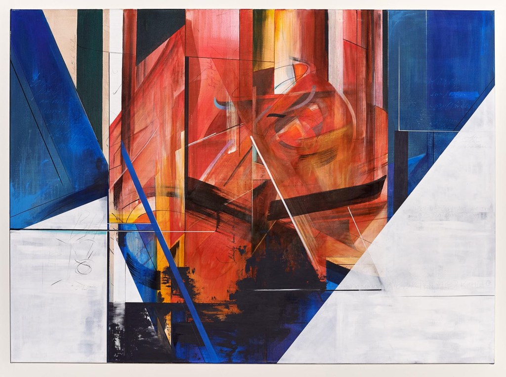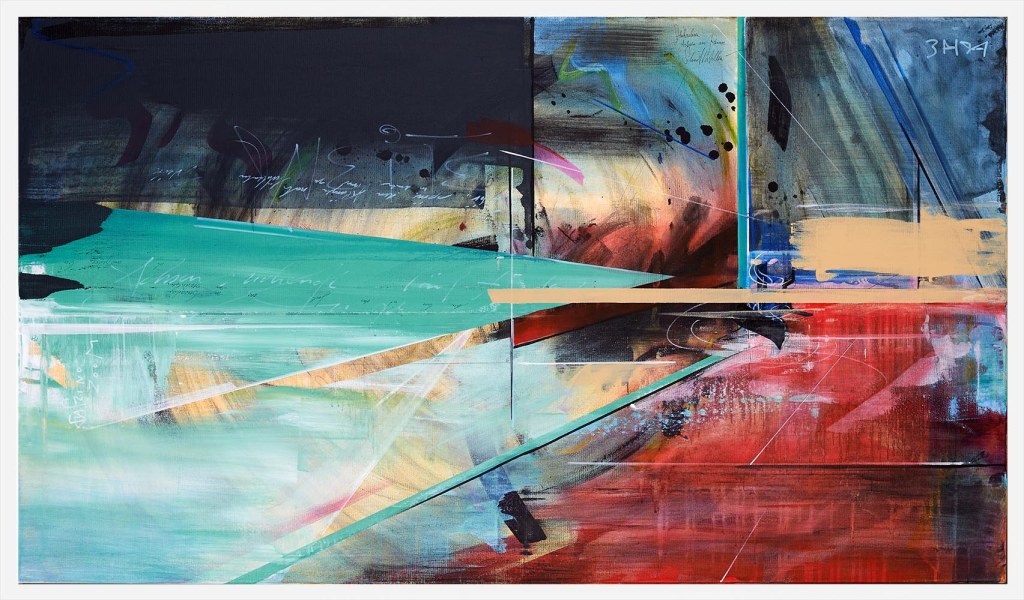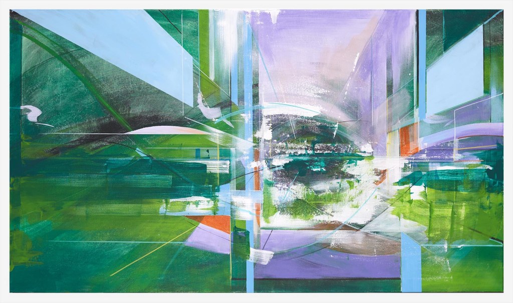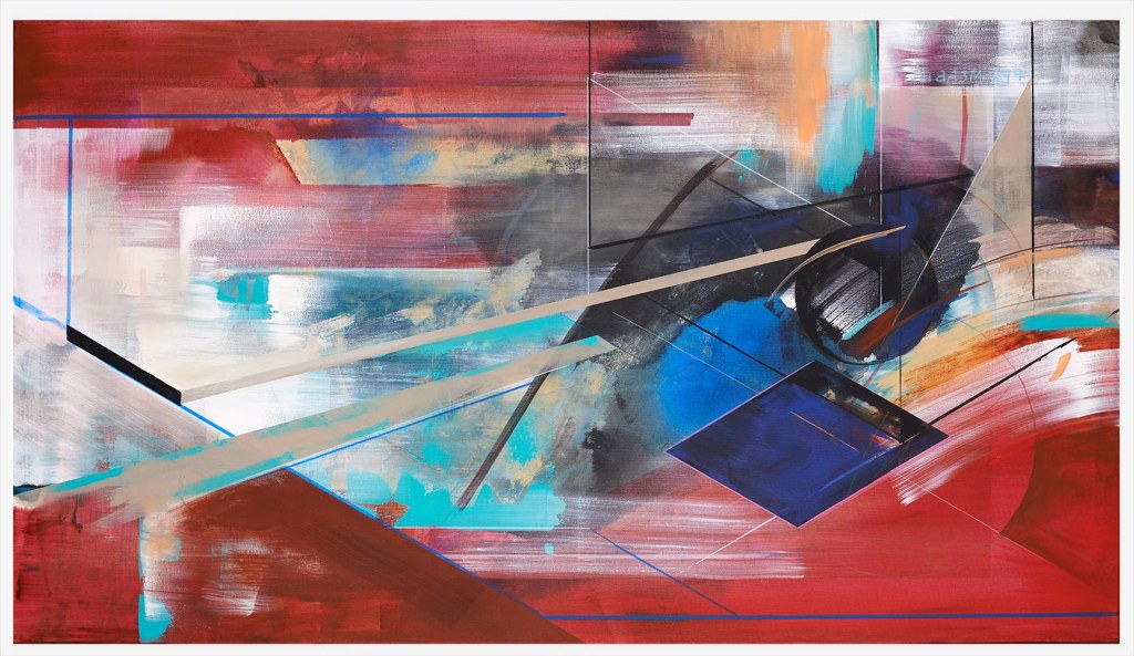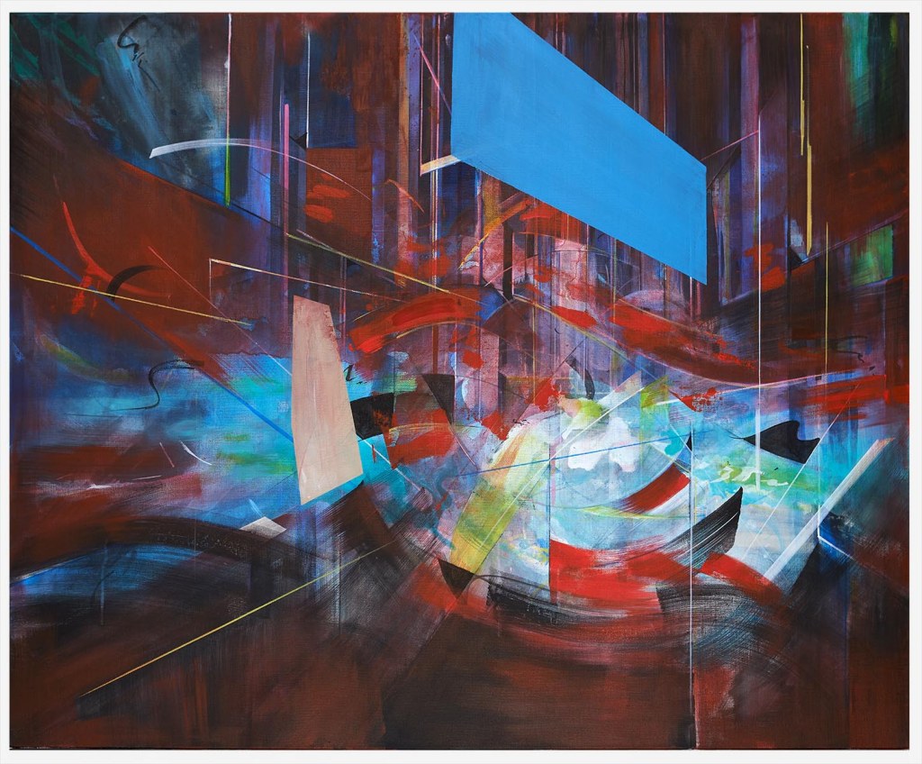 So beschreibt die Kunsthistorikerin Anne Simone Krüger meine Werke und ihre Beschreibung wirkt für mich besonders treffend gegenüber der Bildergruppe „Stages of Transcendence“ (Stufen bzw. Bühnen der Transzendenz). Die ersten dieser Malereien datieren auf das Jahr 2019, die Gruppe erhält jedoch bis heute (Stand 2023) weiteren Zuwachs. (Eine Bilderliste folgt am Ende des Artikels) Die Bilderwelten der Stages of Transcendence enthalten untereinander vielschichtige Verbindungen, während sie zugleich äußerst individuelle Werke darstellen. Auf Formebene ist festzuhalten, dass alle Bilder in Querformaten angelegt sind, was die Wirkung der abstrakten Gebilde bereits in Richtung urbaner bzw. landschaftlicher Assoziationen begünstigt. Viele Fragmente dieser Gebilde sind entlang von perspektivischen Fluchten arrangiert, was den Bildräumen eine teilweise endlos wirkende Tiefe verleiht und beinahe über ihren grundsätzlich abstrakten Charakter hinwegtäuscht; denn hier wurden keine Häuser, keine Personen, Tiere, Bäume oder Sträucher gemalt. Es sind stattdessen allesamt gestische Strukturen, welche unser Blick versucht zu Räumen und Architekturen zu fügen. Hier beziehe ich mich auf ein Muster menschlichen Wirkens. Denn wie der Soziologe Andreas Reckwitz festhält, so besteht unsere menschliche Lebenswelt bis in ihre kleinsten Einheiten aus Praktiken. Jede noch so gereifte menschliche Gesellschaft vollzieht sich immer wieder in der sozialen Praktik. Dieses Verhältnis ist es, welches mich auch in der Malerei interessiert. Ich führe meine gestalterischen Impulse als Gesten in den Bildraum, um deren Charakter als etwas von mir „Gemachtes“ zu betonen. Das Malen an sich, die Prozessualität, soll erfahrbar bleiben, während unser Auge uns zugleich durch Welten führt, die sich aus diesem Schaffen erheben. Alles ist dabei zugleich in Bewegung, wie es dennoch offensichtlich im Stillstand der Malerei gehalten ist. Diese beiden Zwischenräume (zwischen Gegenstand und Abstraktion, zwischen Stillstand und Bewegung) führen schließlich zum hier titelgebenden Begriff der Transzendenz, dessen Wortstamm sich in etwa mit „Überschreiten“ übersetzen lässt und der deshalb in vielerlei Hinsicht für meine Arbeit von Interesse ist.